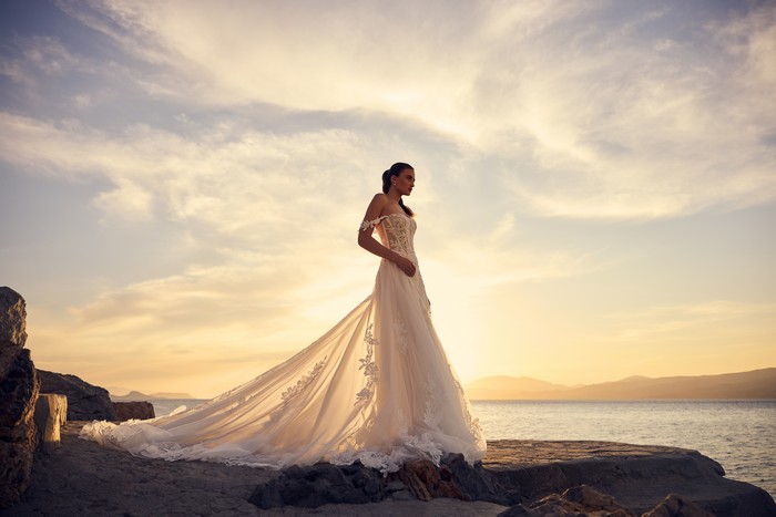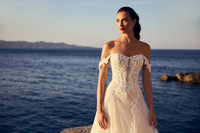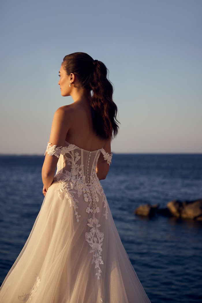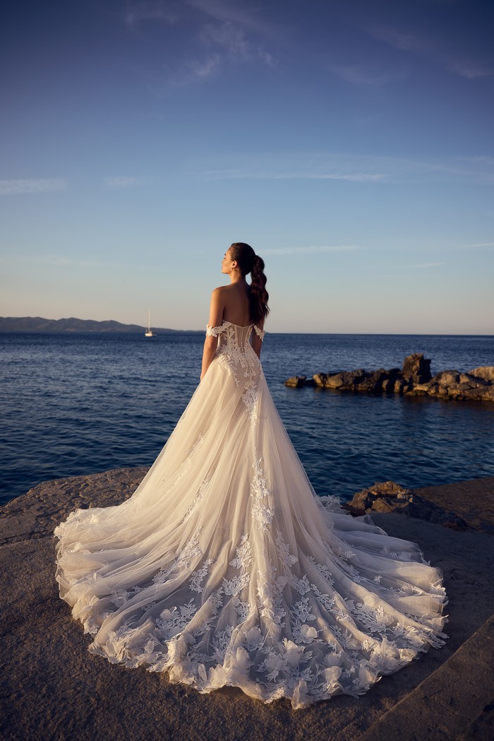 Τα εκπληκτικά μανίκια έξω από τους ώμους, διακοσμημένα με ντελικάτες floral λεπτομέρειες, δημιουργούν ένα αιθέριο και ονειρικό αποτέλεσμα. Τα τρισδιάστατα απλικέ δαντέλας στο μπροστινό και πίσω μέρος του φορέματος συνεχίζουν αρμονικά μέχρι το τελείωμα της ουράς, προσθέτοντας λάμψη και κίνηση σε κάθε βήμα. Ένα νυφικό φόρεμα που υπόσχεται να κλέψει τις εντυπώσεις.