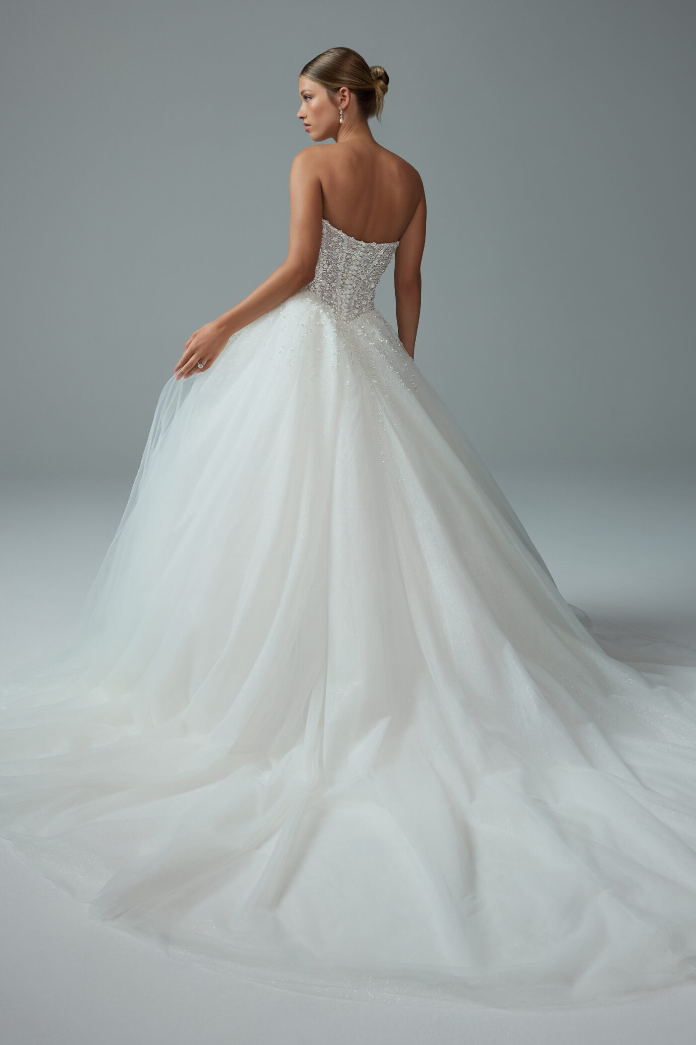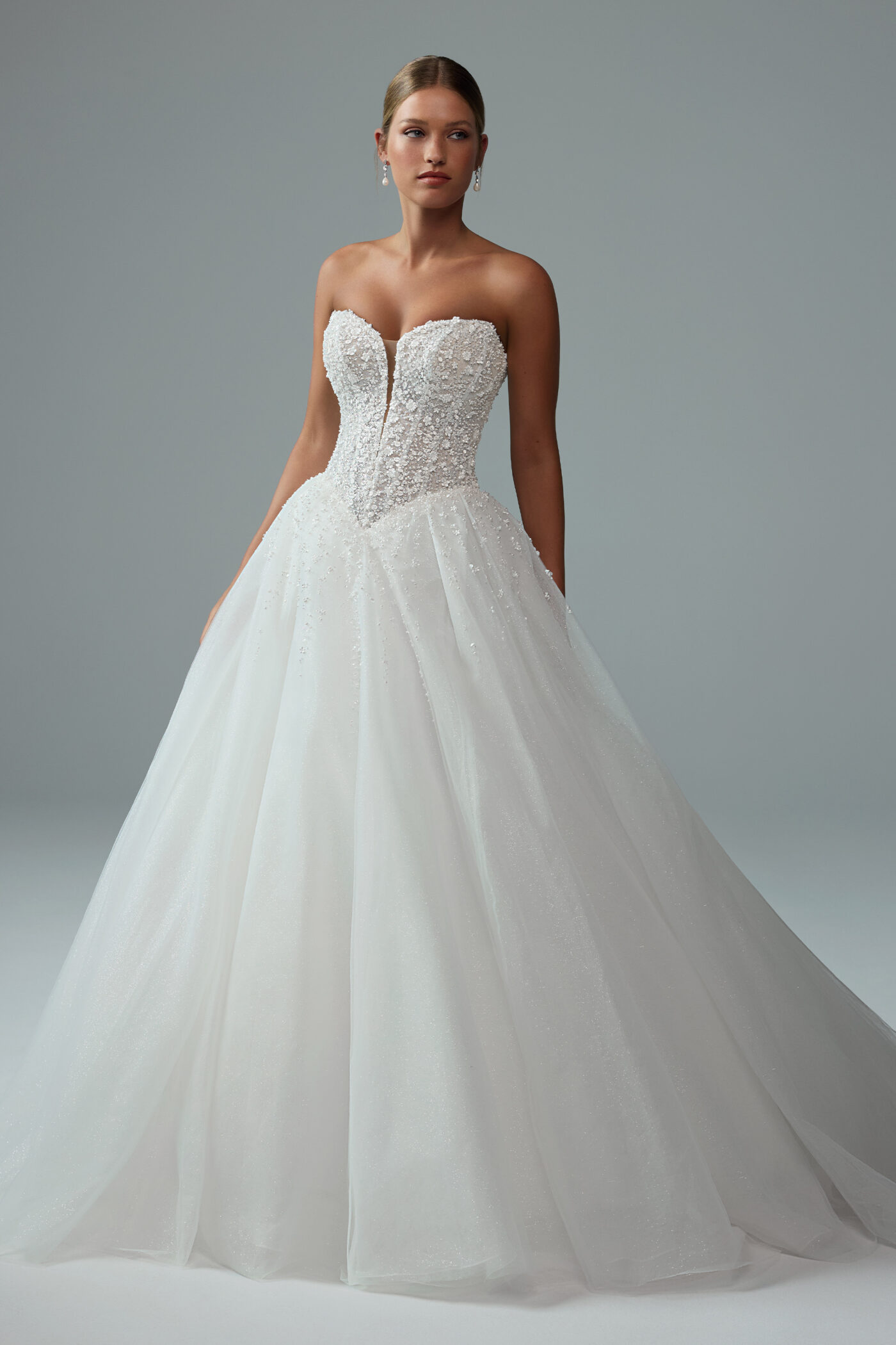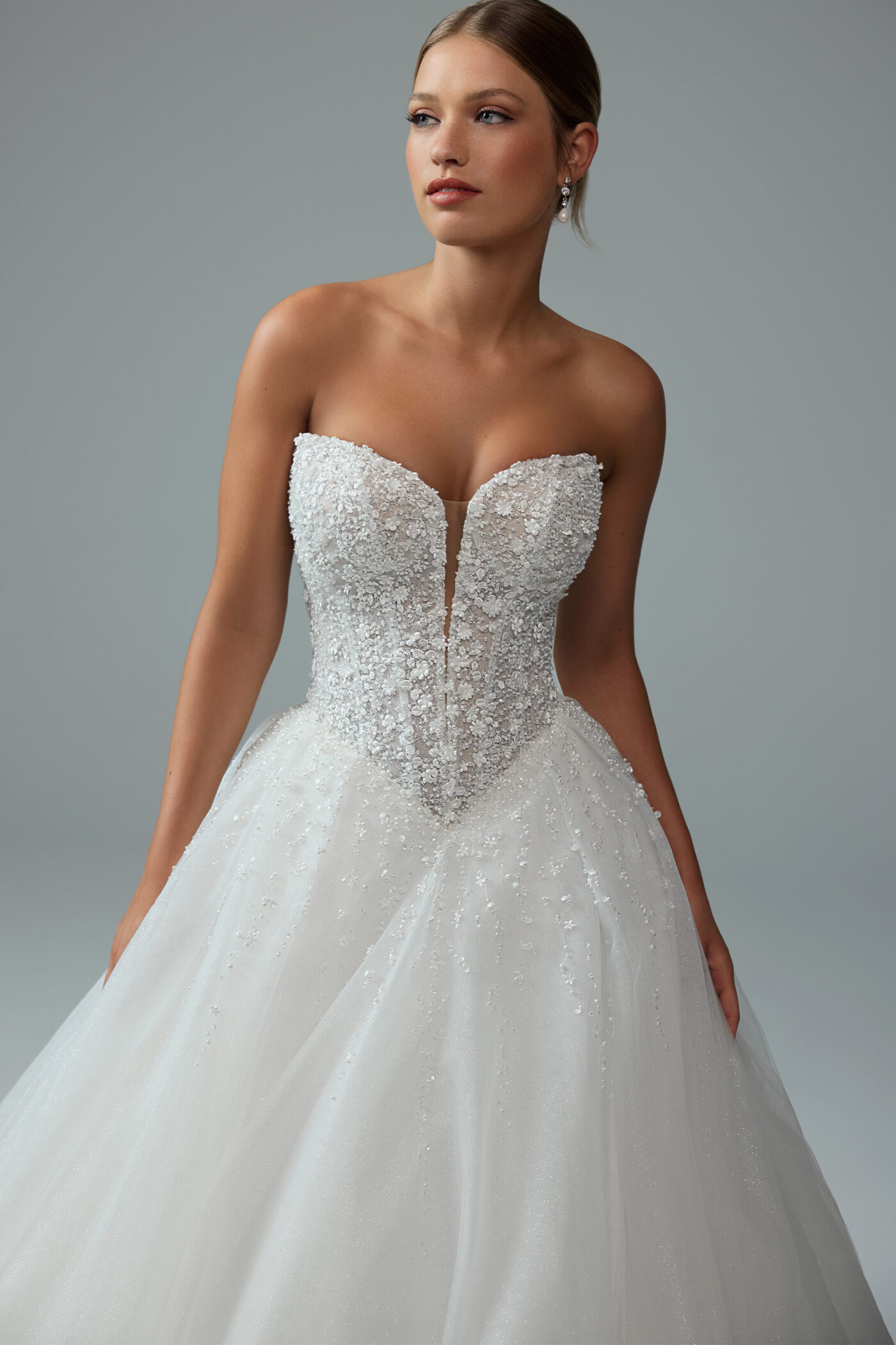 Σας παρουσιάζουμε το νυφικό φόρεμα Vienna! Διαθέτει ημιδιάφανο μπούστο χωρίς τιράντες με V ντεκολτέ, που δίνει μια μοντέρνα πινελιά στην παραδοσιακή εμφάνιση του νυφικού με ball gown. Όμορφες πέρλες και μικροσκοπική τρισδιάστατη floral δαντέλα διακοσμούν ολόκληρο το μπούστο και απλώνονται στο πάνω μέρος της φούστας. Αυτές οι ρομαντικές λεπτομέρειες συμπληρώνουν τέλεια τα κουμπιά που είναι καλυμμένα με ύφασμα στο πίσω μέρος του μπούστου, τα οποία κουμπώνουν πάνω από το φερμουάρ. Το νυφικό Vienna σχεδιάστηκε για νύφες που θέλουν να νιώθουν σαν πριγκίπισσες στο γάμο τους.